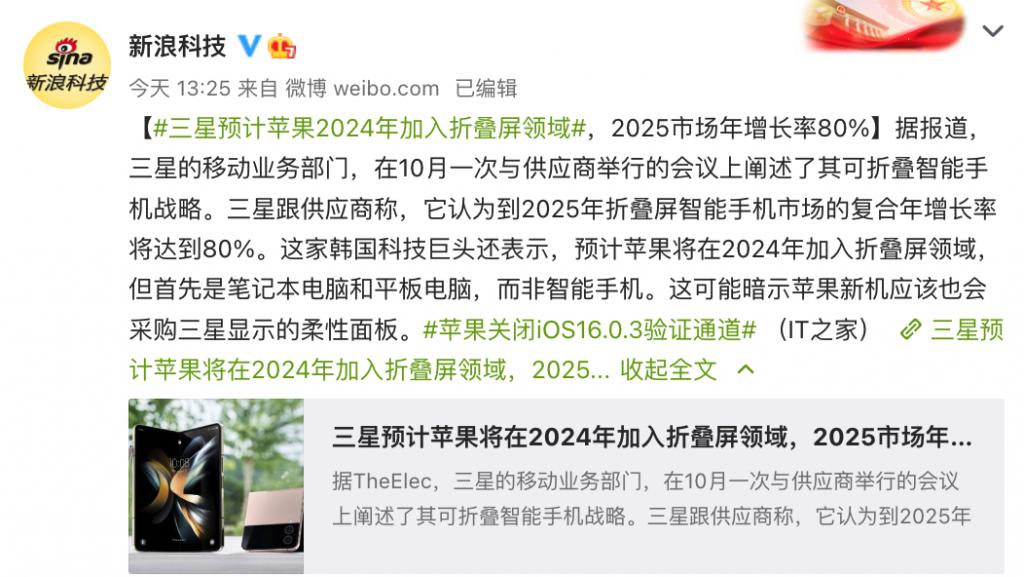 新浪科技去年的一份報道中也曾提到過,"(三星)預計蘋果將在 2024 年加入折疊屏領域,但首先是筆記本電腦和平板電腦,而非智能手機。"