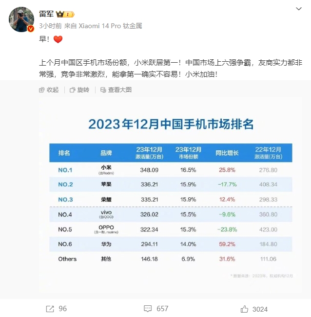 2023年出貨量同比增長6.5%,中國手機市場拐點已至,小米在12月登頂