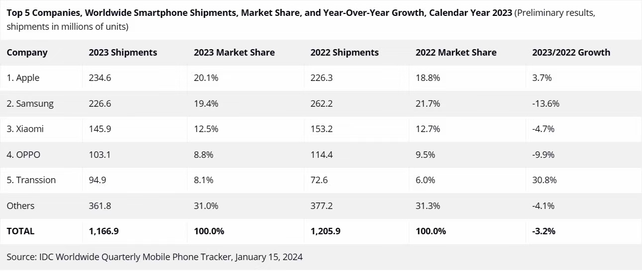 另外根據IDC披露的最新數據,2023年,蘋果首次超越三星成為全球手機出貨量最高的公司,排在第三位的則是小米,出貨量為1.46億部,市場份額為12.5%。