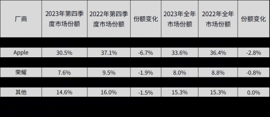附 2023 年中國平板電腦市場排名前五廠商具體市場份額及變動(dòng)如下,前五名分別是華為、蘋果、小米、榮耀、聯(lián)想。