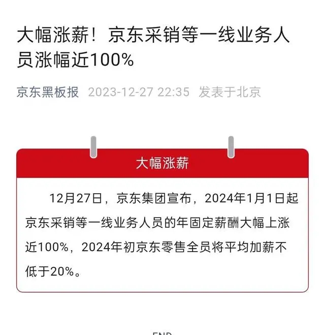 - 最近幾日,電商平臺可謂“你方唱罷我登場”。前腳淘寶剛因“支持僅退貨”收獲熱搜榜首,后腳京東也不甘示弱地連發兩條薪酬調整的消息。 12月27日晚,京東集團宣布,202