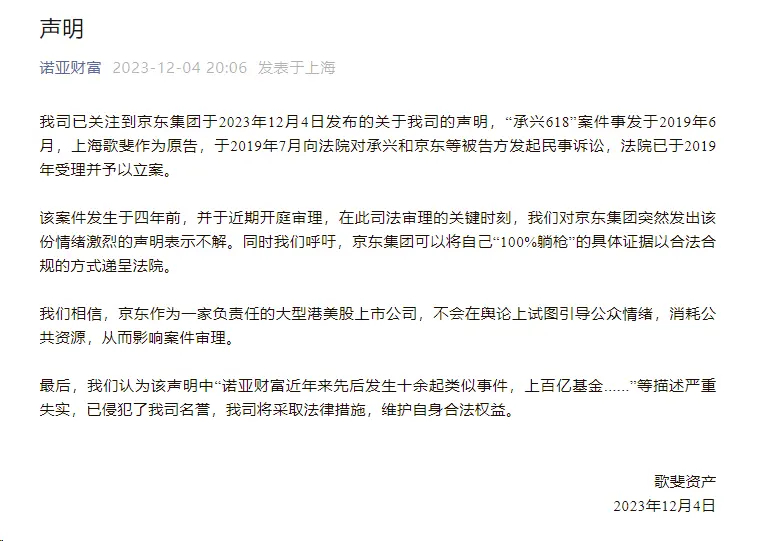 - 對于12月4日京東怒懟諾亞財富,稱其推卸責任、尋找替罪羊一事,諾亞財富旗下歌斐資產回應了。 12月4日晚間,諾亞財富旗下歌斐資產發布聲明稱,呼吁京東將自己“100%躺槍”的具體