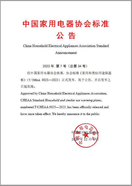 - 經中國家用電器協會批準,協會標準《家用和類似用途保溫板》(T/CHEAA 0025—2023)正式發布,現予公告,并自發布之日起實施。中國家用電器協會標準公告2023年第7號《家用和類似用途保溫