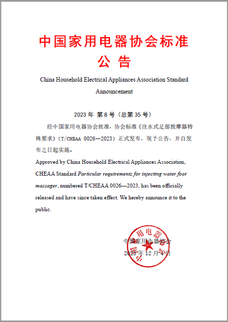 - 2023年12月4日,中國家用電器協會兩項團體標準正式發布,分別為T/CHEAA 0025—2023《家用和類似用途保溫板》和T/CHEAA 0026—2023《注水式足部按摩器特殊要求》。這兩項標準均自