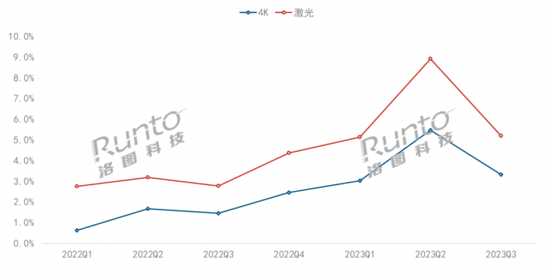 - 據洛圖科技(RUNTO)最新數據顯示,2023年第三季度,中國智能投影(不含激光電視)市場銷量為140.7萬臺,同比上漲9.7%;銷額為20.1億元,同比下降14.5%。 這其中在業界備受期待的激光智能投影也在Q3繼