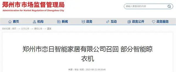 - 據鄭州市市場監督管理局網站8月21日消息,日前,鄭州市戀日智能家居有限公司按照《消費品召回管理暫行規定》的要求,主動向河南省市場監督管理局、鄭州市市場監督管理局報告了召回計劃,將自即