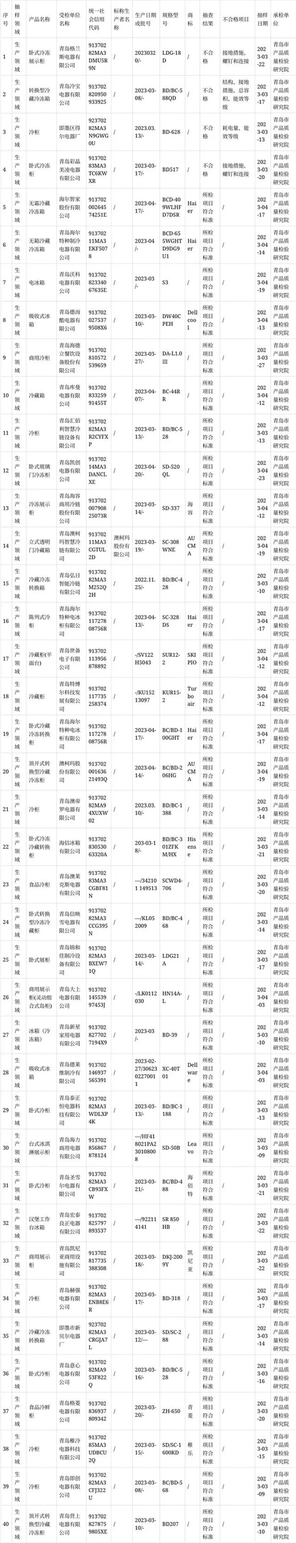 - 青島市市場監管局抽查40批次電冰箱和冷柜產品 4批次不合格