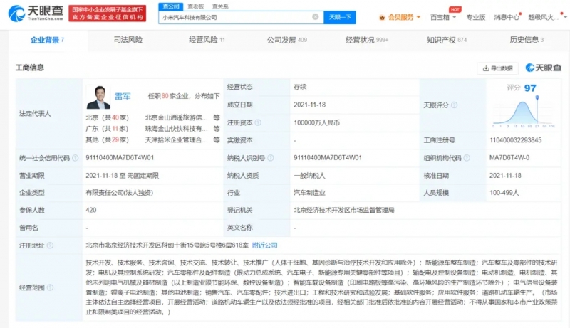 - 8月23日,天眼查App顯示,近日,小米汽車科技有限公司登記備案“xiaomiev.com”網站域名。該公司成立于2021年11月,法定代表人為雷軍,注冊資本10億人民幣,經營范圍包括技術開發、新能