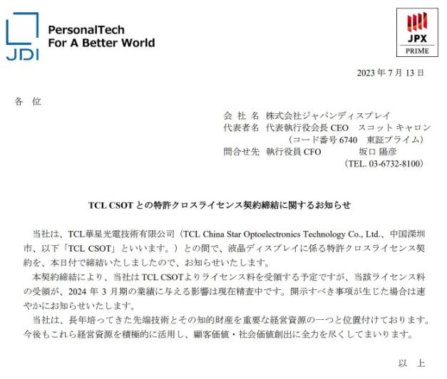 - 據(jù)日經(jīng)中文網(wǎng)報(bào)道,日本顯示器公司(JDI)昨日宣布,與中國(guó) TCL 科技集團(tuán)旗下華星光電(CSOT)簽訂了相互使用知識(shí)產(chǎn)權(quán)的交叉授權(quán)協(xié)議,JDI 在液晶面板可視角度等方面具有技術(shù)優(yōu)勢(shì)。▲ 圖源 JDI