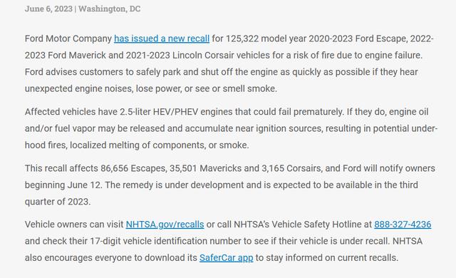 - 6月11日消息,美國國家公路交通安全管理局顯示,福特汽車申請召回部分2020-2023年銳際(Escape)、2022-2023年Maverick皮卡和2021-2023年Corsair汽車,共計125322輛,以應對發動機故障引起的火災