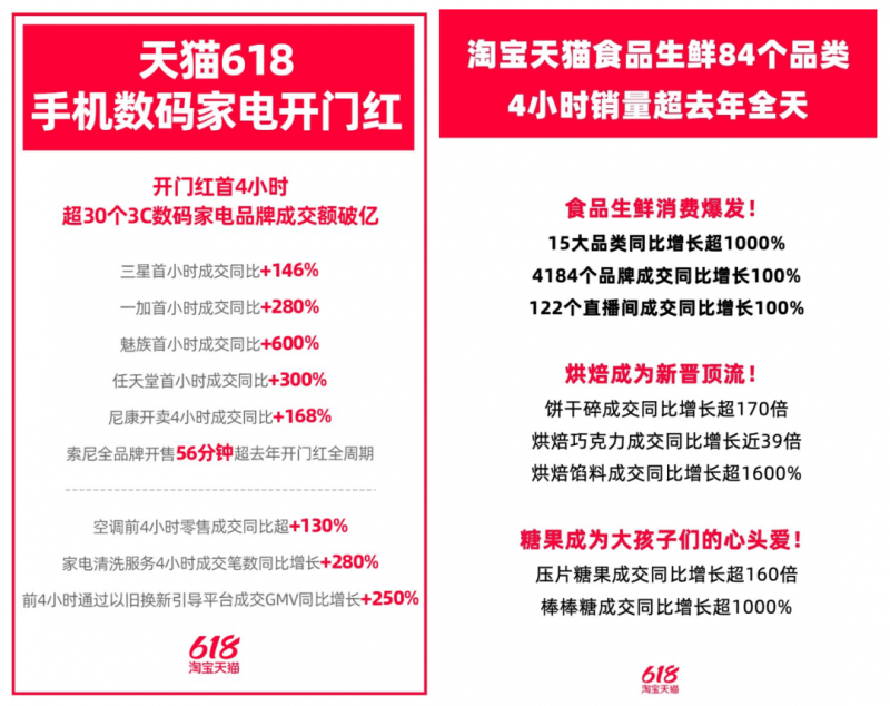 - 618首輪消費(fèi)熱潮過后,增長仍體現(xiàn)在各家的成績單中。 淘寶天貓發(fā)布的相關(guān)數(shù)據(jù)顯示,平臺618活動啟動后4小時(shí)內(nèi),美妝、生鮮、家電等多條賽道表現(xiàn)不俗,其中,生鮮15大品類同比增長超1000%,4184
