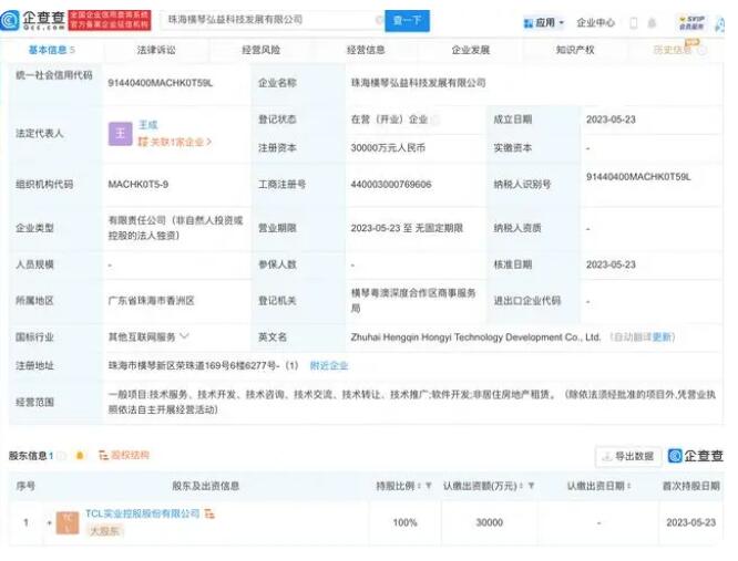 - 企查查APP顯示,近日,珠海橫琴弘益科技發(fā)展有限公司成立,法定代表人為王成,注冊資本3億元人民幣,經(jīng)營范圍包含:軟件開發(fā);非居住房地產(chǎn)租賃等。企查查股權(quán)穿透顯示,該公司由TCL實業(yè)控股股份有限