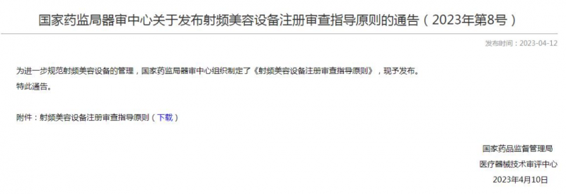 - 為進一步規范射頻美容設備的管理,昨日(4月13日),國家藥品監督管理局醫療器械技術審評中心發布《射頻美容設備注冊審查指導原則》(下稱《指導原則》),意在為射頻美容設備注冊申報資料的準備