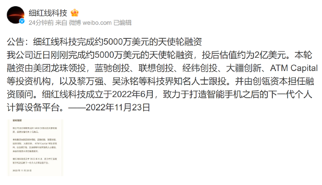 - 11月23日上午消息,今日,羅永浩AR創業公司細紅線科技宣布近日剛剛完成約5000萬美元(約合3.57億元)的天使輪融資,投后估值約為2億美元(約合14.28億元)。 細紅線科技表示,本輪融資由美團龍
