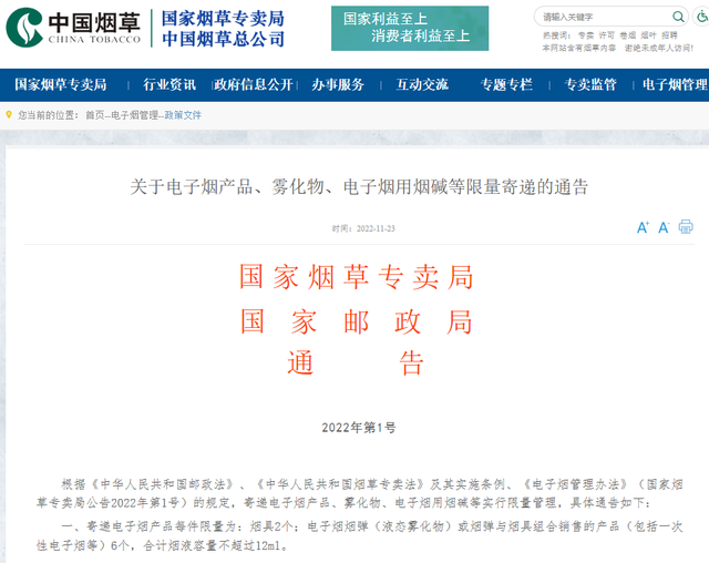 - 國家煙草專賣局:寄遞電子煙產品等實行限量管理