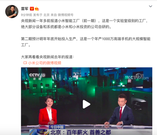 - 雷軍:小米智能工廠第二期預計明年年底開始投入生產