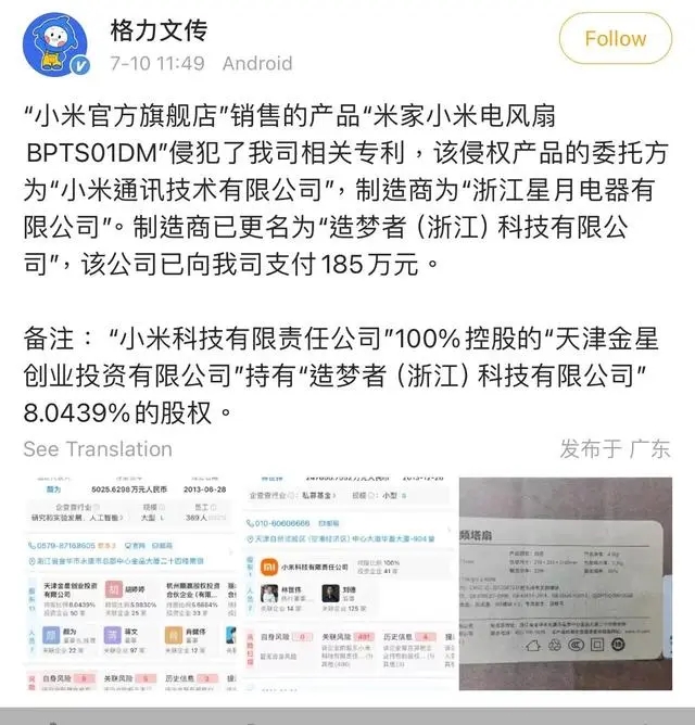 - 7月10日,小米、格力之間再起硝煙,繼董明珠在股東大會上質疑小米后,一款米家電風扇侵權事件,讓雙方再次上了熱搜。在采訪中,格力方面向北京商報記者展示了相關證據,而小米方面則重在澄清侵權主