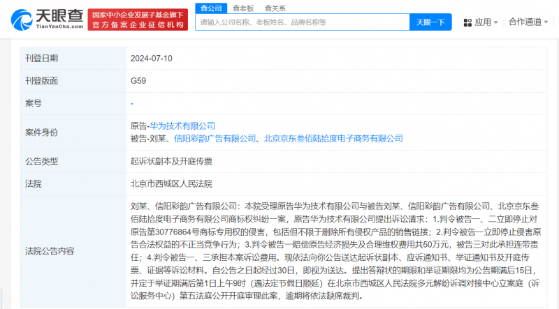 - 南方財經7月12日電,天眼查法律訴訟信息顯示,近日,北京市西城區人民法院向被告劉某、信陽彩韻廣告有限公司公告送達起訴狀副本及開庭傳票等,涉及華為技術有限公司與上述被告等相關商標權糾紛