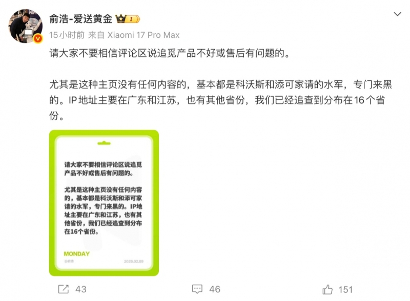- 2月9日,追覓CEO俞浩在微博發(fā)文炮轟科沃斯和添可,他表示請大家不要相信評論區(qū)說追覓產(chǎn)品不好或售后有問題的,“尤其是這種主頁沒有任何內(nèi)容的,基本都是科沃斯和添可家請的水軍,專門來黑