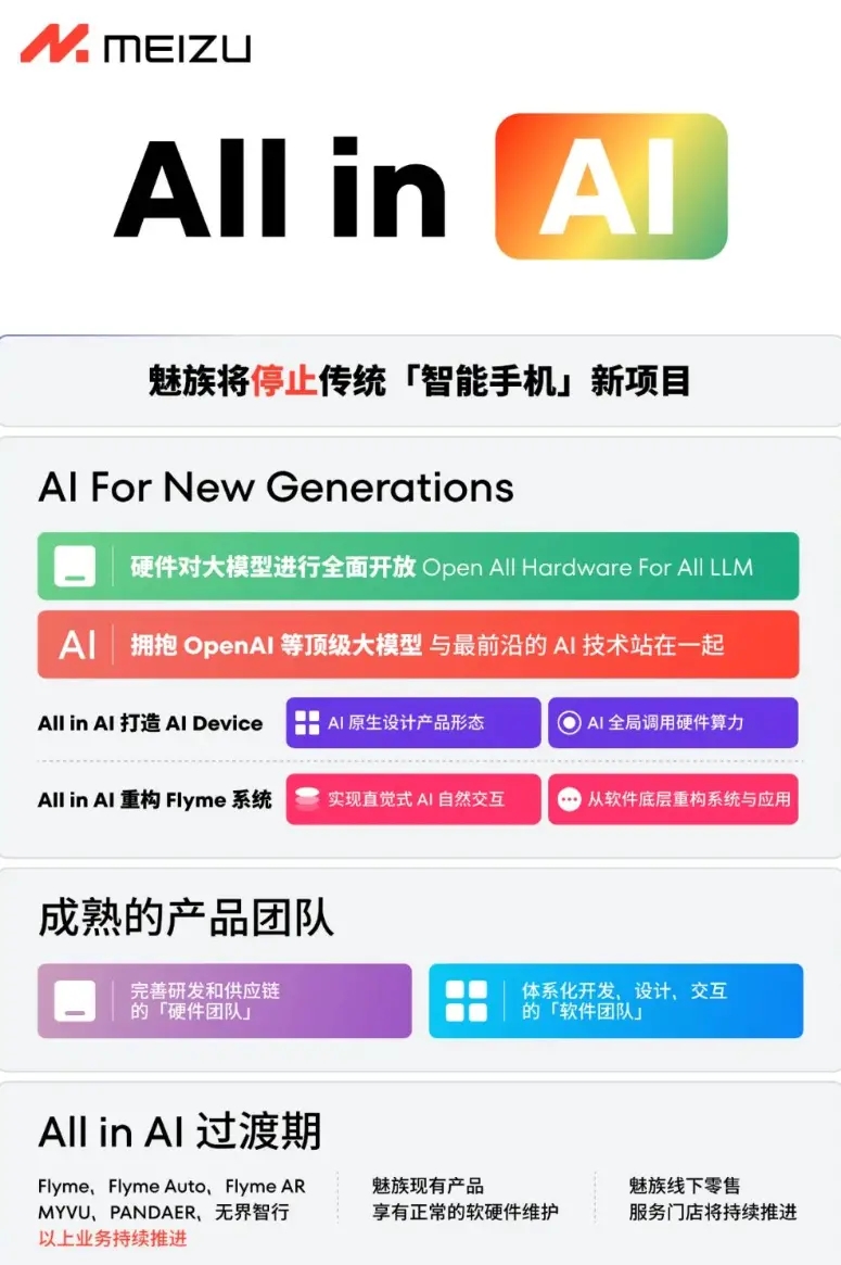 - 魅族宣布將停止傳統(tǒng)“智能手機(jī)”新項(xiàng)目,向AI領(lǐng)域轉(zhuǎn)型