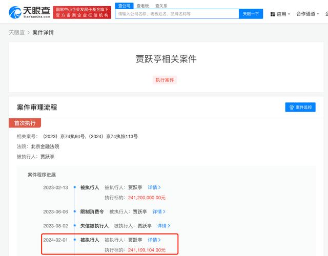 - 天眼查App顯示,近日,賈躍亭新增一則恢復執行信息,執行標的2.41億余元,涉及中國證券監督管理委員會與賈躍亭行政處罰案件,執行法院為北京金融法院。 值得一提的是,近期,樂視網信息技術(北京)