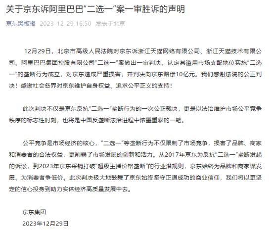 - 備受外界關注的京東訴阿里“二選一”壟斷案又有了新進展,據京東黑板報消息,12月29日,北京市高級人民法院做出一審判決,京東勝訴并獲賠10億元。 對此,阿里巴巴對證券時報&mi